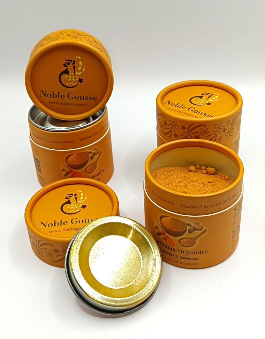 Nous présentons notre curcuma en tube de 50 g. Le paper tube affiche des nuances dorées. Il rappelle la beauté naturelle de l’épice. Il protège la poudre et conserve sa fraîcheur. Ainsi, sa couleur et son parfum sont préservés. Ce curcuma s’intègre facilement dans une cuisine moderne et met en valeur l’identité Noble Gousse.